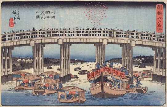 また、当時の浮世絵には、橋や水路に浮かぶ館船から両国の花火を見る様子が描かれていました。両国の花火大会は大飢饉と疫病の流行による犠牲者の慰霊と疫病退散を祈り、打ち上げられたことが由来と言われています。COVID-19の影響で、2020年、2021年に続き2022年の隅田川花火大会は中止となりました。見上げる夜空は寂しいですが、街灯りは私たちの暮らしを守ってくれるようです。